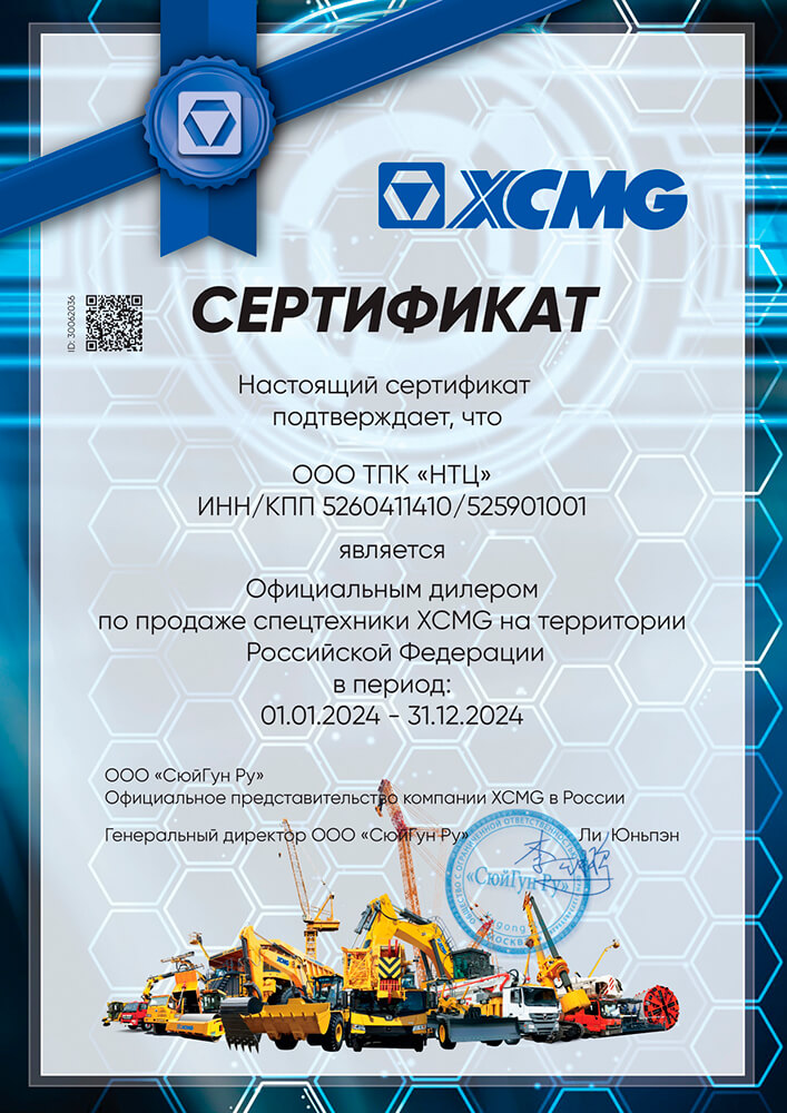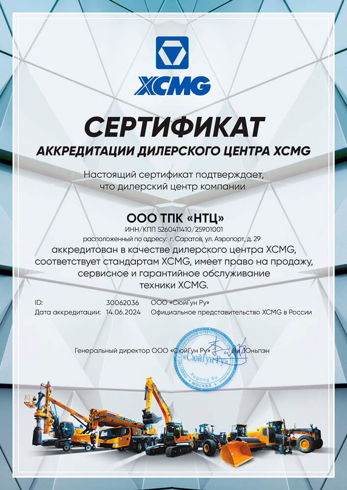 ООО ТПК «НТЦ» входит в дилерскую сеть ООО «СюйГун Ру» и уполномочена осуществлять продажи и сервисное обслуживание спецтехники XCMG.