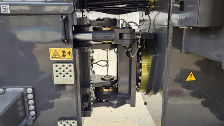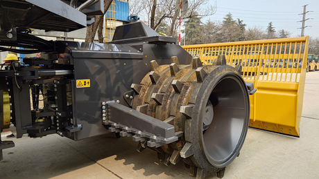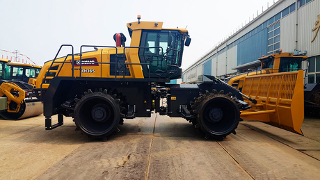Эксплуатационная масса этой машины 36100 кг, она оснащена дизельным двигателем Cummins номинальной мощностью 466 л. с. На каждом стальном колесе установлено по 60 съемных кулачков на шести полигональных уплотняющих сегментах. Машина данного класса может преодолевать уклон до 100% и имеет два диапазона скорости.