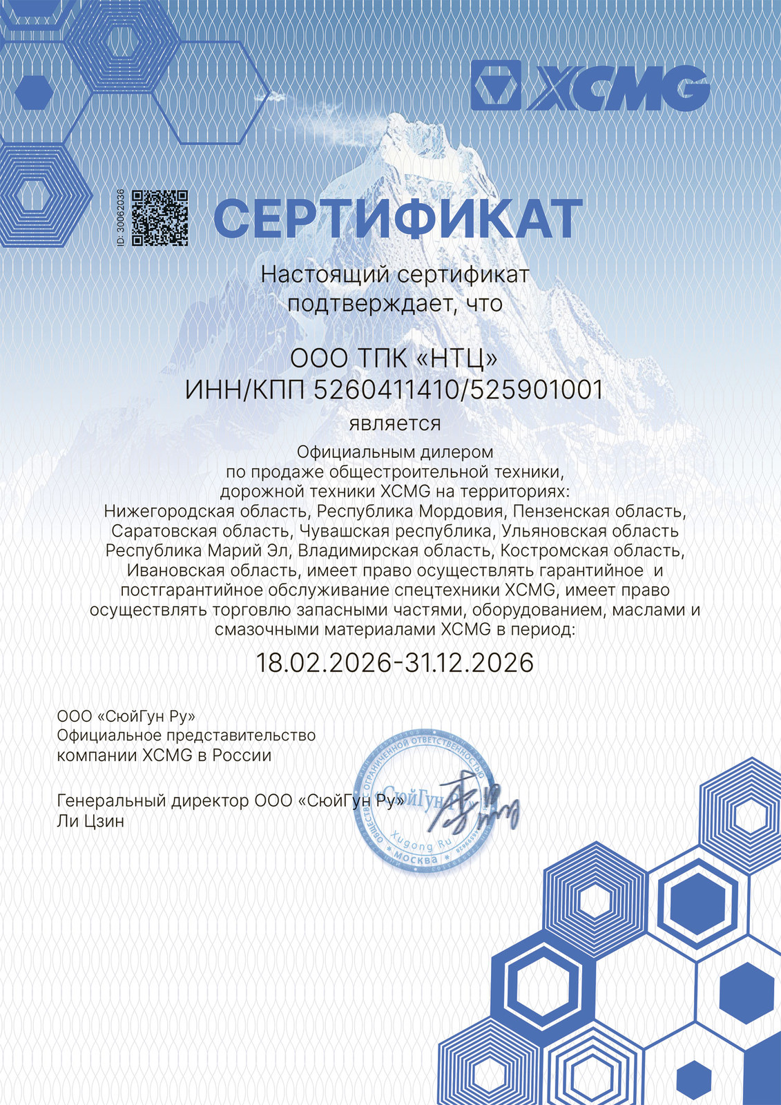 Компания ООО ТПК "НТЦ" является официальным дилером по продаже общестроительной техники, дорожной техники XCMG на территориях: Нижегородская область, Республика Мордовия, Пензенская область, Саратовская область, Чувашская республика, Ульяновская область, Республика Марий Эл, Владимирская область, Костромская область, Ивановская область, имеет право осуществлять гарантийное и постгарантийное обслуживание спецтехники XCMG, имеет право осуществлять торговлю запасными частями, оборудованием, маслами и смазочными материалами XCMG в период 18.02.2026-31.12.2026.