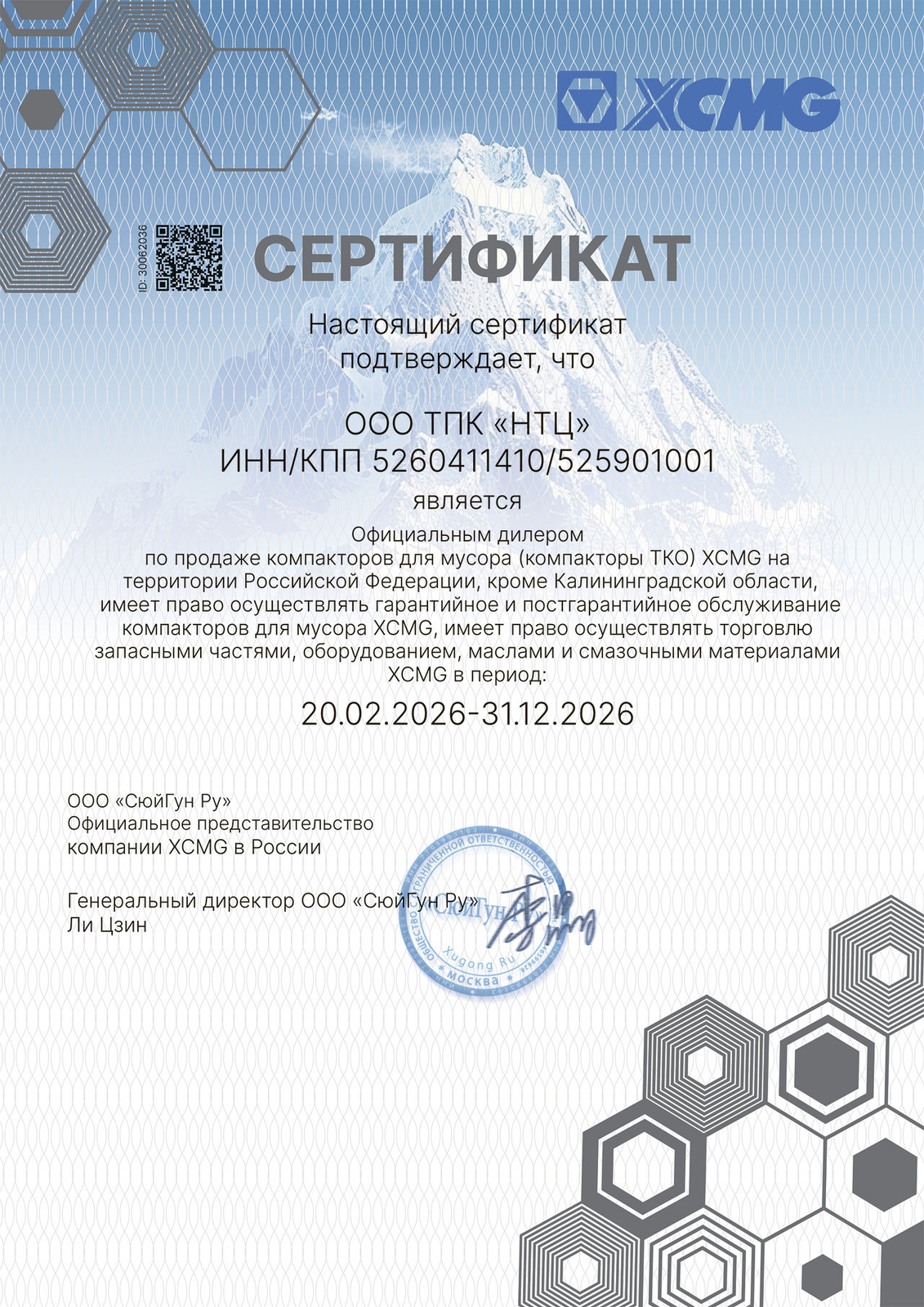 А также ООО ТПК "НТЦ" является официальным дилером по продаже компакторов для мусора (компакторы ТКО) XCMG на территории Российской Федерации, кроме Калининградской области, имеет право осуществлять гарантийное и постгарантийное обслуживание компакторов для мусора XCMG, имеет право осуществлять торговлю запасными частями, оборудованием, маслами и смазочными материалами XCMG в период 20.02.2026-31.12.2026.